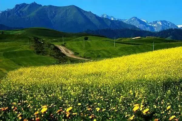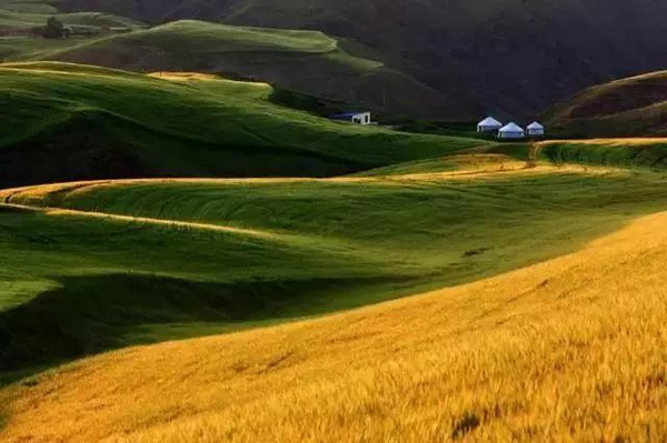 这里冬无严寒,夏无酷暑,一草一木,一山一水都写满了绿色与美丽,充满着神奇和诱惑。从奇台县往南,经过碧流河,来到半截沟山脚下,走过一段大约10公里的山间小路后,一片美景闯入视线。路边的绿色慢慢多起来,先是漫山遍野的黄绿色、浅绿、翠绿色的大麦田,像是被精心裁剪过的绿毯。