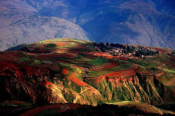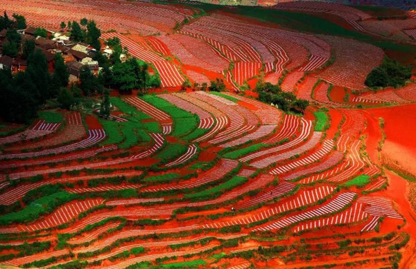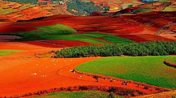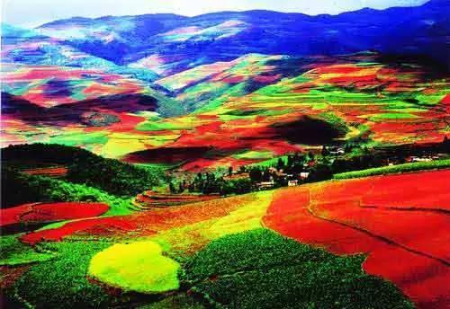 云南东川红土地被专家认为是全世界初巴西里约热内卢外最有气势的红土地,而其景象比巴西红土地更为壮美。云南地处温暖湿润的环境,土壤里的铁质经过氧化慢慢沉积下来,逐渐形成了炫目的色彩。东川红土地指的是位于昆明市东川区西南40多公里的新田乡、有一名叫"花石头"(在109公里程碑处)的地方,这里方圆近百里的区域是云南红土高原上最集中、最典型、最具特色的红土地。每年9至12月,一部分红土地翻根待种,另一部分红土地已经种上绿绿的青稞或小麦和其他农作物,远远看去,就像上天涂抹的色块,色彩绚丽斑斓,衬以蓝天、白云和那变幻莫测的光束,构成了红土地壮观的景色。