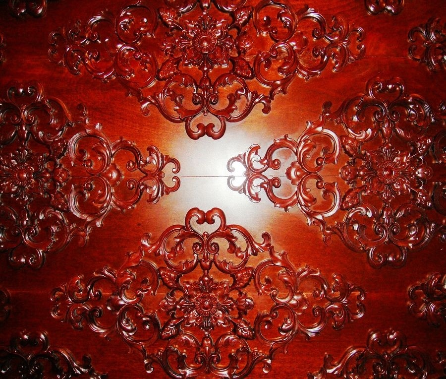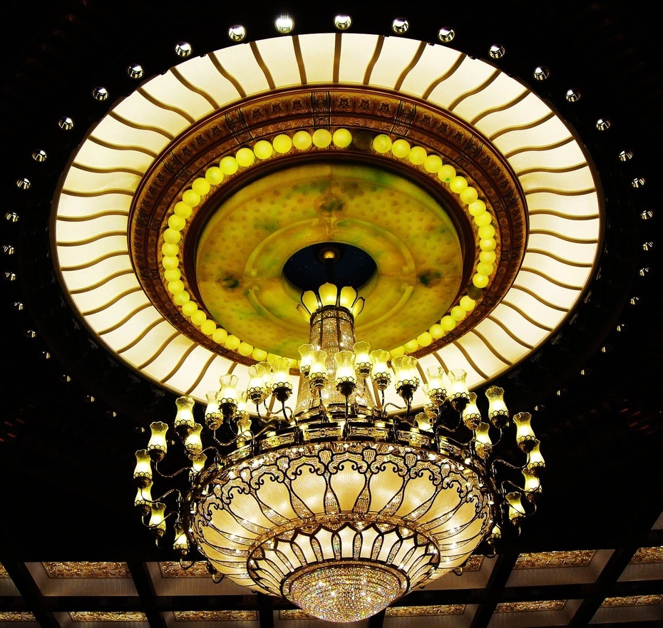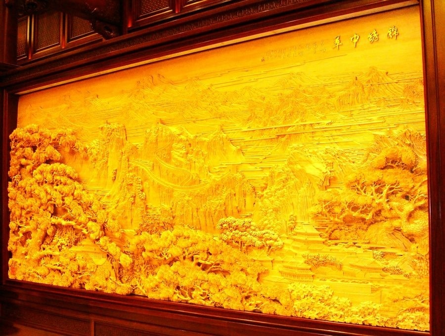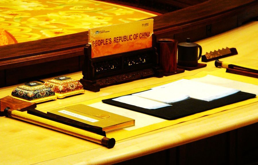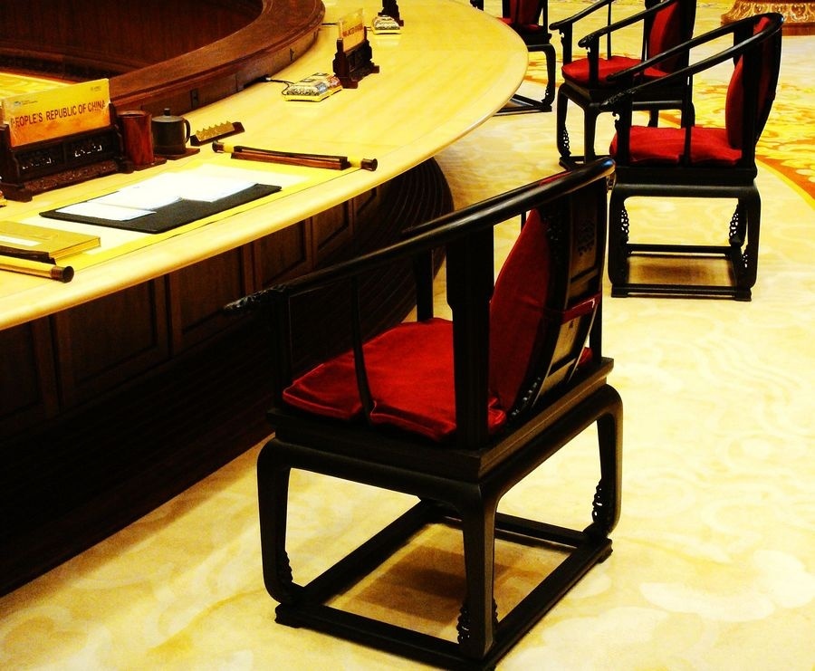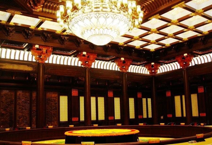主会议室采用传统的中式风格,以木质装修为主,雕梁画栋,富丽堂皇。红木材质吊顶,厚实的圆桌和中式木椅简单大方,传统的汉唐布置让会场内充满浓郁的中国风貌。会议室设置一个巨大的圆桌,分别摆放着12把椅子。会议室顶部装饰着一个如和氏璧般的灯箱,灯箱中间垂吊着一盏巨型水晶吊灯。会议室的地毯是一个整体,厚实松软,鲜艳夺目。